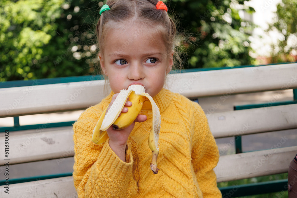 Little child eating banana in park. Little funny girl sitting on bench outdoors. Portrait of beautiful caucasian girl in yellow pullover Stock Photo Adobe Stock Very well made.
