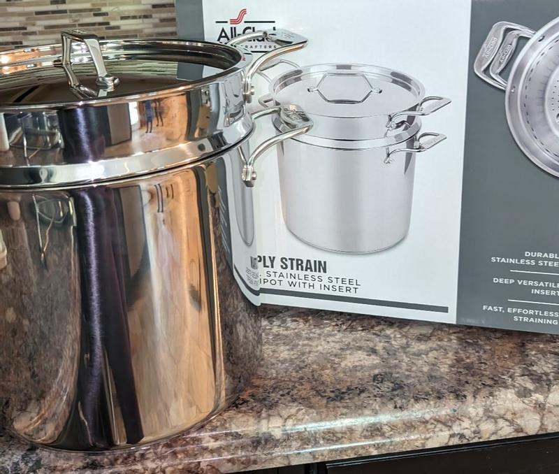 All Clad Simply Strain Stainless Steel Stockpot Multipot With Insert Lid 8 Quart Induction Oven Broiler Safe 600F Strainer Pasta Strainer with Handle Steamer Pot Pots and Pans Silver Amazon Home Very well made.